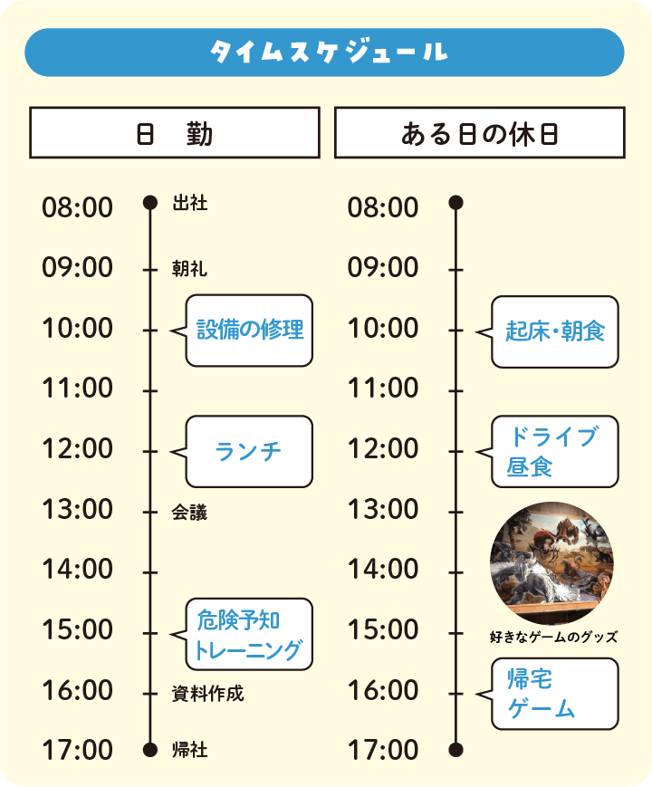 Q 一日のタイムスケジュールや休日の過ごし方は?